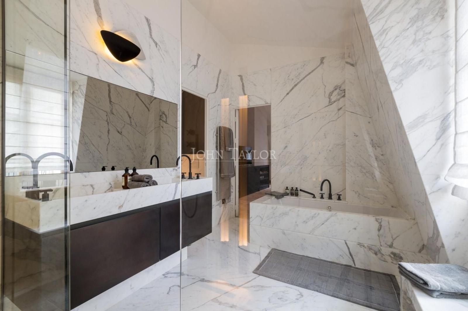 Une belle suite avec sa salle de bains en marbre et son dressing